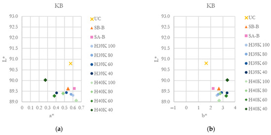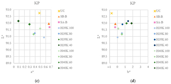 CIE L*a*b* coordinates for the investigated substrates and coatings. (a) and (b) L*-a* and L*-b* coordinated for the KB substrate. (c) and (d) L*-a* and L*-b* coordinated for the KP substrate.