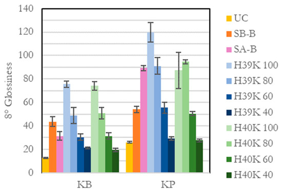 The most interesting value, however, is related to the glossiness of the surface (Figure 9). Indeed, regardless the coating, the substrate generally achieved higher glossiness values. It can be observed how increasing kaolin amounts—for almost every experimental coating—significantly reduces the glossiness of the coating. This is not true for H40K 100, where the coating defects (as of Figure 2) strongly influenced the measurements, as highlighted by the high standard deviation.