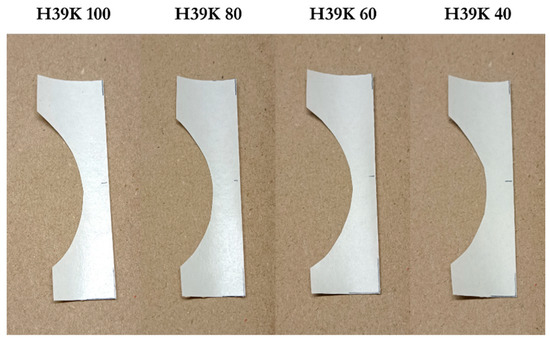 Specifically, stripes were attributed to the wire wound on the K-Bar, as confirmed by SEM micrographs. Indeed, Figure 2b was analyzed with ImageJ in 15 different points, measuring the average peak distance of the grooves. The results report a 150 ± 6 μm average distance, which corresponds to the diameter of the wire wound on the K-Bar. Such phenomenon disappears as kaolin is added to the formulations, showing how it is related to the pure latex. It must be noted how, in general, H39K 100 and H40K 100 coatings are sticky—regardless of their Tg—possibly leading to blocking when processed in an industrial plant.