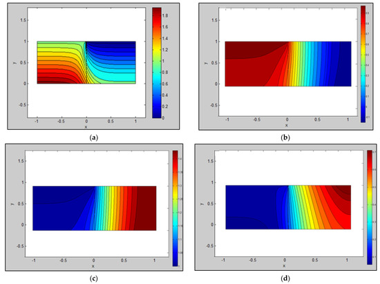 Solving the above PDEs between −d ≤ x ≤ d facilitates the comprehension of the Fickian gas phase transport with the GDL in terms of the variation of temperature, oxygen concentration, water vapor concentration, and saturation. The computed results are represented in the form of 2D contour plots, as shown in Figure 3. These results are utilized to justify the trends computed from the 1D model developed by this study. In other words, the PDEs are solved in a general manner, where the computed variables have no quantitative meaning but shed light on the expected output trends. Figure 3a, for instance, demonstrates a decreasing trend of temperature along the height of the GDL (positive y-axis) within the negative region of the x-axis. This is because Fickian transport assumes a constant heat flux boundary condition applied to the catalyst side and a temperature boundary condition at the top layer of the GDL [25], as shown in Figure 2, hence the decrease in temperature. This temperature trend has also been previously verified in GDLs with high in-plane electrical resistivity [26]. Physically, what happens is that the oxygen initially enters the channel with a relatively low temperature. This low temperature limits the reaction rates and consequently limits local current densities, which controls the reaction rates [26]. Therefore, the localized temperatures of the GDL at the catalyst layer take a longer time before they attains peak temperatures. In the positive region of the x-axis, the temperatures of the GDL are relatively lower, owing to the fact that oxygen (reactant) is fully consumed, thus bringing the electro-chemical reactions to a halt, and the GDL drops in temperature. The effect of temperature on the reaction rates are further highlighted in the concentration variations of oxygen (reactant) and water vapor (product), as shown in Figure 3b,c. For instance, as the temperature increases, the rate of electro-chemical reactions increase, which increases the consumption of oxygen, hence the decrease in concentration. The decrease in oxygen concentration is accompanied by an increase in the concentration of the water being produced, as evident in Figure 3c, hence the increase in saturation shown in Figure 3d. This all coincides with the 1D model of the mole fraction of oxygen and water vapor concentration in Figure 4.
