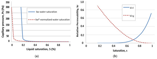 (a) Capillary pressure vs. liquid saturation, (b) relative permeability vs. saturation.