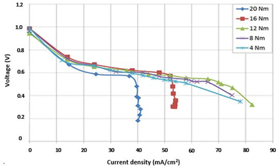 According to the conducted experiments and their results, the amount of compression exhibits profound effects on the overall cell performance, in particular within high current density regions. Figure 6 shows that, at intermediate current densities, increasing the compression enhances the output cell voltage, thus enhancing the overall performance of the cell. Similar trends are also obtained in [27]. This enhancement is attributed to the decrease in contact resistances as compression forces increase. Nevertheless, the cell voltage dramatically decreases beyond a certain point at high compressions. This sudden drop is attributed to the increased overpotentials at high compression torques, specifically mass transport overpotentials, as shown in Figure 7a. This is because, at increased compression, the GDL porosities decrease, thus lowering the permeability and effective diffusivity [27]. In addition, the increase in mass transport overpotentials can also be attributed to the increased amounts of water production at high current density operations. Therefore, it is essential to control the compression and determine an optimal ratio to ensure effective fuel cell operation. In addition, Figure 7b also sheds light on how the current density increases with increasing the compression torque up to 12 Nm. Beyond this value, especially at the low operating voltages, a rapid current reduction is observed. This drop is due to the reduction in the porosity of the GDL, which prevents the reactants from migrating through the catalyst layer.