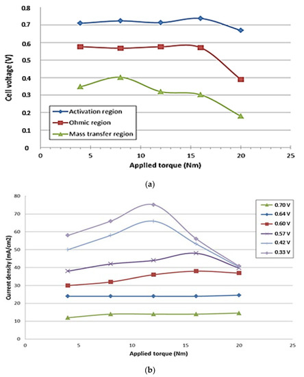 (a) Applied torque vs. cell voltages at the activation, ohmic, and mass transfer regions, (b) applied torque vs. current density at the different operating voltages.