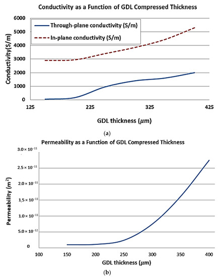 (a) Conductivity as a function of GDL compressed thickness, and (b) permeability as a function of GDL compressed thickness.