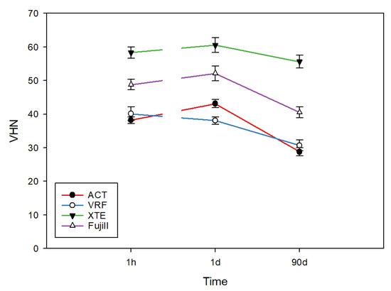 Table 2 presents the VHN data for each type of material and the data are graphically shown in Figure 1. The VHN baseline data after 1 h of dry storage ranged between 38.2 and 58.3, which then decreased to a range between 28.8 and 55.6 after 90 days of water storage. XTE had the highest VHN before and after storage, followed by Fuji II. ACT had the lowest VHN. The aging period caused a significant reduction in VHN over time; the baseline values (after 1 h) were higher than those recorded at 90 days (p < 0.05). This decrease over time in VHN varied from 5% (XTE) to 25% (ACT). On the other hand, the surface hardness increased for ACT (p < 0.05) after being stored for 24 h in water; the others showed no significant differences (p > 0.05).
