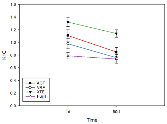 Fracture toughness (KIC) values are shown in Table 3 and Figure 2. The KIC values varied between 0.98 and 1.32 MPa·m0.5. Significant differences were found among materials on day 1 (p < 0.05). The highest value was found for XTE, with Fuji II showing the lowest (p < 0.05) (after both 1 and 90 d of storage). However, all KIC values decreased significantly with the time spent in storage (p < 0.05), except for Fuji II. Ultimately, ACT, VRF, and Fuji II all had comparable KIC results after 90 days of aging (p > 0.05).