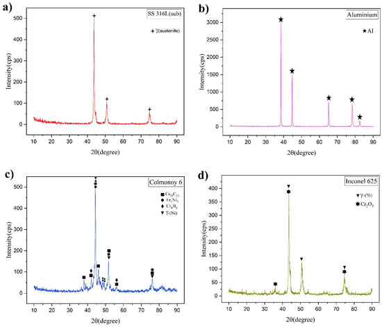 XRD of (a) SS 316 L, (b) aluminum, (c) Colmonoy-6, and (d) Inconel 625.