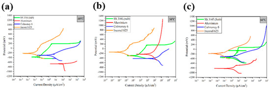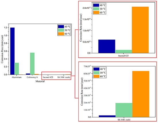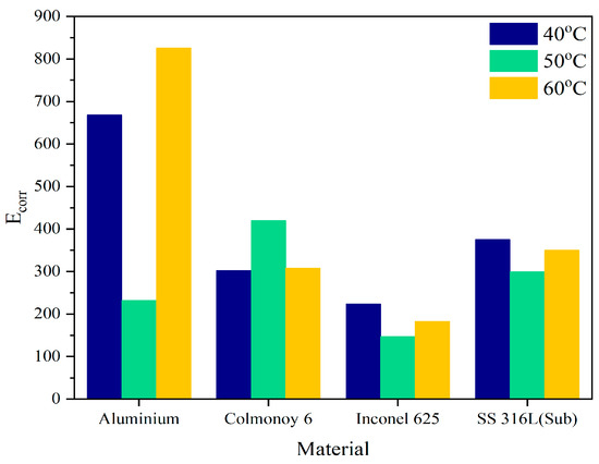 From 40 to 50°C, the diffusion of chloride ions rises, and oxygen solubility decreases, making the NiO layer challenging to recover [27,28]. Increased oxygen ion penetration at 60 °C induces the production of a Cr2O3 oxide layer, which has high corrosion resistance and protects the coating with a barrier mechanism, improving the corrosion resistance of the Colmonoy coating at 60 °C compared to 50 °C. For the Inconel-coated specimens, the minimum corrosion current density is attained at 50 °C, while the lowest (most negative) corrosion potential is observed at 60 °C. For this sample, we observed a slight deterioration in corrosion behavior at 60 °C, attributed to the higher/easier diffusion of Cl and oxygen ions at this temperature [26]. Figure 7, Figure 8 and Figure 9 represent important corrosion parameters, showing that overall, Inconel-coated specimens outperformed the other coatings.