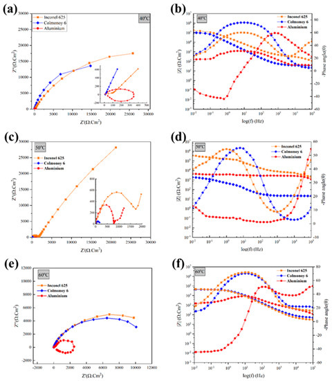 - At 40 °C and 50 °C, the Inconel coating has the highest corrosion resistance among the examined samples, and Al has the lowest corrosion resistance. Although there are three loops in the Nyquist curve of the Al coating, inferring the formation of oxide layers, the Tafel test results indicate that severe corrosion occurs. This was explained by the formation of AlCl4− and the removal of the passive layer from the surface.