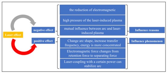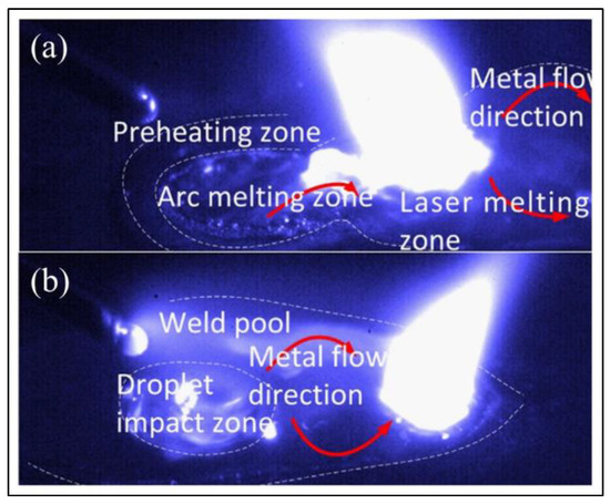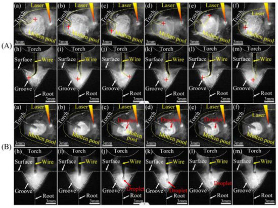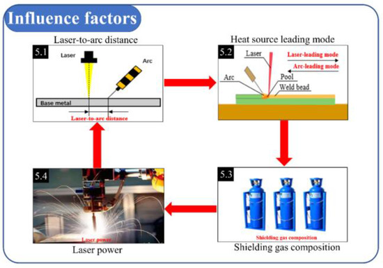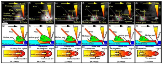 - Heat source leading mode: The different relative positions of the laser and arc have a momentous impact on the surface formation and internal performance of the weld. The arrangement of heat sources has a great influence on the absorption efficiency of the laser, and exerts an effect on the dynamic behavior of the droplet, the behavior of the molten pool, and the temperature field. Whether one uses laser-leading mode or arc-leading mode plays a vital role on the droplet transfer and transfer frequency in hybrid welding.