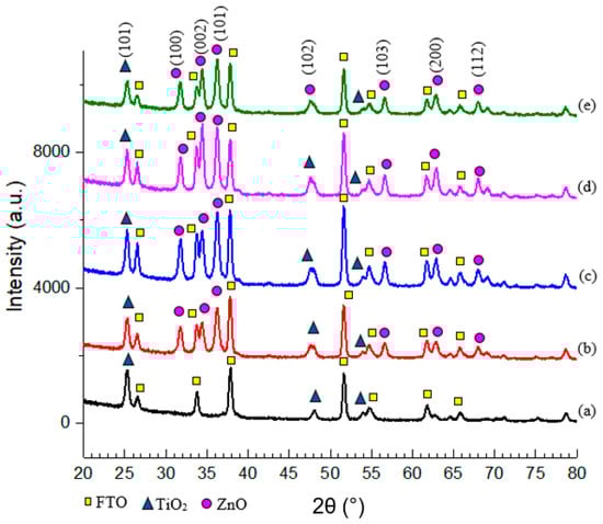 The XRD pattern for (a) n-TiO2/FTO substrate annealed at 600 °C for 1 h; n-TiO2/ZnO bilayer thin film annealed at 500 °C for (b) 1, (c) 1.5, (d) 2, and (e) 2.5 h, respectively.
