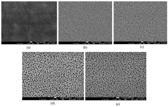 FE-SEM images of top view of (a) n-TiO2/FTO substrate annealed at 600 °C for 1 h, n-TiO2/ZnO bilayer thin films annealed for (b) 1, (c) 1.5, (d) 2, and (e) 2.5 h at 500 °C, respectively.