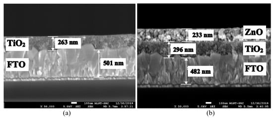 FE-SEM cross-sectional images of (a) the n-TiO2/FTO substrate annealed at 600 °C for 1 h and (b) n-TiO2/ZnO bilayer thin films annealed at 500 °C for 2 h.