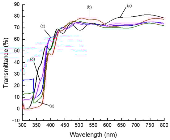 The transmittance spectra of (a) the n-TiO2/FTO substrate and the n-TiO2/ZnO bilayer thin films annealed for (b) 1, (c) 1.5, (d) 2, and (e) 2.5 h at 500 °C, respectively.