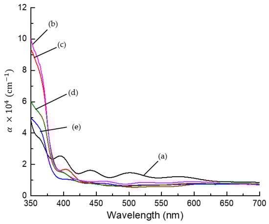 Change of α with λ for (a) the n-TiO2/FTO substrate and the n-TiO2/ZnO bilayer thin films annealed for (b) 1, (c) 1.5, (d) 2, and (e) 2.5 h at 500 °C, respectively.