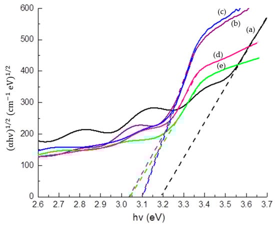 Extrapolated band gap of (a) the n-TiO2/FTO substrate and the n-TiO2/ZnO bilayer thin films annealed for (b) 1, (c) 1.5, (d) 2, and (e) 2.5 h at 500 °C, respectively.