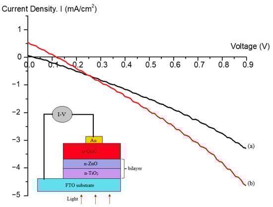 I-V measurement of the n-TiO2/ZnO bilayer/p-Cu2O heterostructure thin film at (a) dark and (b) illumination. The inset shows an illustration of the device.