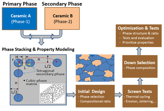 Flowchart for the concept and the design of an example two-phase composite ceramic and the sequential steps for developing and optimizing the topcoat in a TBC system.