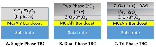 Schematics of the coating structures of the single, dual, and tri-phase composite TBCs.