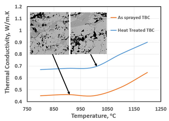 The thermal conductivity, K, of the two-phase TBC was measured up to about 1200 °C before and after the thermal aging at 1300 °C for 25 h, as shown in Figure 8. The K values for as-sprayed TBC are about 0.45~0.65 W/m K, in the temperature range of 1000~1200 °C, which demonstrates the merit of low thermal conductivity, as in other representative Low-K TBC systems [32,33,34]. With the thermal aging and sintering of the TBCs, it is expected that a negative impact on thermal conductivity will happen, which can partially be attributed to the coating densification. The dependence of the thermal conductivity of YSZ on temperature can be explained by a theory considering the effect of the scattering of phonons by point defects (oxygen vacancies and solute) and by the “hopping” of oxygen vacancies. It also considers an increase in the effective thermal conductivity at high temperatures, due to radiation. For the porous coating, it is believed that some pores will be annihilated and result in an increase in K value above 1000 °C. Based on microstructural observation, inspection, and analysis of the thermal behaviors of the tested TBCs, the phase composite TBC exhibited its superiority in terms of thermal stability, sintering resistance and low thermal conductivity capability.
