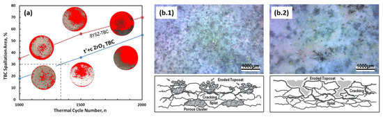 Thermal shock behavior of two-phase TBC in burner rig test: (a) Plot of TBC spallation area percentage versus the thermal cycling number; (b.1) schematic failure modes of the dual-phase TBC after 2000 cycles; (b.2) failure modes of the single-phase 8YSZ-TBC after 2000 cycles.