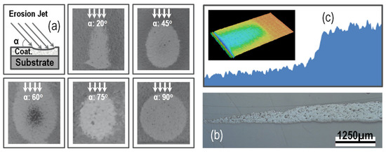 Particles of micron size that impact on the surfaces of components or coatings can result in microscale deterioration, such as erosion, fracture, cracking, deformation and/or hardening. This erosive wear behavior in a material typically falls into three categories: Mode I for ductile materials such as metals and alloys; Mode II for brittle materials such as ceramics; Mode III, which is observed in certain polymers. These modes generally show that higher rates of erosion occur at lower impinging angles (Mode I) or higher impinging angles (Mode II), respectively. Ultimately, these impacts can lead to the localized removal of coating materials and subsequent functional failure [12]. Mode-III erosion is particularly pertinent for composite materials. Researchers have studied the erosive wear resistance of yttria-stabilized zirconia (YSZ) and lanthanum zirconate (LZO) coatings, which are prospective Low-K thermal barrier coatings (TBCs). Ramachandran et al. evaluated the erosion responses of these TBCs in relation to porosity, the velocity of the erodent, and the impact angle [13]. Furthermore, Mahade et al. studied the erosion performance of gadolinium zirconate (GZO) and its composite TBCs produced by suspension plasma spray (SPS) [14,15,16] and found that the material composition and microstructural design had a major impact on their erosion behaviors. In most of the cases, the increase in YSZ phase content and coating density for those TBCs showed better erosion resistance.