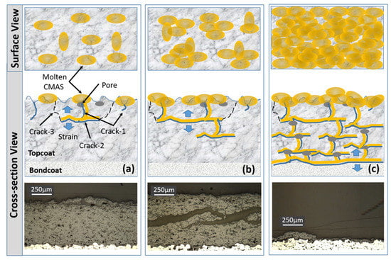 This process begins with a short-time spread-out stage, followed by a long-duration liquid flow stage. It has been reported that CMAS melts and wets the surface of samples at 1250 °C, with the dynamic contact angles decreasing drastically over time during this spreading process; contact angles range from 3° to 20°, depending on the substrate. In thermal sprayed TBCs, these contact angles can vary, due to factors such as roughness, or grain size defects in the coating. Upon reaching a steady state in the spreading process, infiltration follows, beginning from the locations of coating defects. In Figure 15, several types of coating defects are indicated in the TBC topcoat. Cracking Type 1 refers to the intrinsic cracking of a coating that occurs during its formation, with dimensions typically being on the microscale. Cracking Type 2 is caused by the penetration and associated strain due to CMAS; this typically has macroscopic dimensions. Cracking Type 3 develops as a consequence of Cracking Type 2, leading to delamination, spallation, and/or the buckling of the coating. Macro- and micro-porosities in these coatings provide entry points for CMAS penetration when molten. Following entry, CMAS will continue to penetrate into the coating via defects such as widespread cracks and large pores.