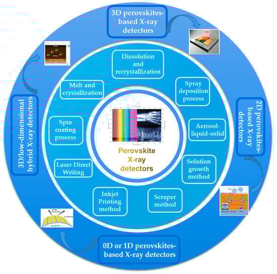 The quality of the film is the key factor to determine the performance of perovskite-based X-ray detectors. Fabrication methods are classified as a spin-coating process, dissolution and recrystallization method, spray deposition process, aerosol–liquid–solid method, solution growth method, scraper method, inkjet printing method, and laser direct writing and melt and crystallization. In the following, we describe these methods, introduce representative works, and analyze their features.