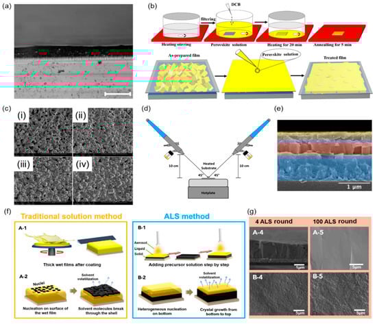 Spin-coating, dissolution and recrystallization, spray deposition, and aerosol–liquid–solid methods. (a) The cross-sectional optical microscopy of perovskite films and the scale bar is 100 µm. Reprinted with permission from Ref. []. 2015, Springer Nature. (b) CsPbBr3 thick film preparation and repair process diagram. Reprinted with permission from Ref. []. 2019, Wiley. (c) SEM images of (i) the original CsPbBr3 thick film, and the treated thick films with (ii) 5, (iii) 10, and (iv) 20 times dissolution and recrystallization. Reprinted with permission from Ref. []. 2019, Wiley. (d) Spraying device for depositing double-layer perovskite film. Reprinted with permission from Ref. []. 2020, Optica. (e) SEM cross-sections of different layers of perovskite solar cells. Reprinted with permission from Ref. []. 2020, Optica. (f) Comparison of traditional solution-based approach to film production (left) and the aerosol–liquid–solid method (right). This highlights the latter’s unique ability to manufacture high-quality thick perovskite films. Reprinted with permission from Ref. []. 2021, Cell Press. (g) Cross-section (upper) and top-view SEM images (lower) of perovskite films fabricated by the aerosol–liquid–solid method after 4 (left) and 100 growth cycles (right). Reprinted with permission from Ref. []. 2021, Cell Press.