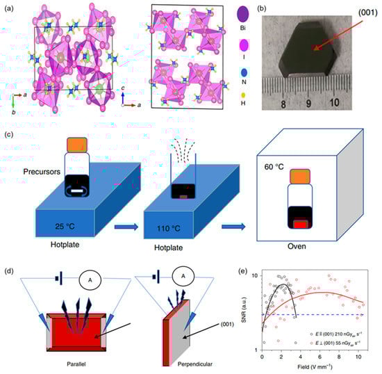 (NH4)3Bi2I9 belongs to organic–inorganic hybrid perovskite-related materials A3M2X9 (A = Cs, Rb, NH4; M = Bi, Sb; X = Br, I). The (NH4)3Bi2I9 has a 2D layered structure where the BiI6 octahedra corners share each other and are stacked in a close-packed fashion in the (001) plane (Figure 6a) []. In 2019, Renzhong Zhuang et al. verified the 2D (NH4)3Bi2I9 without toxic elements is a suitable material to obtain a high-performance X-ray detector []. Layered (NH4)3Bi2I9 grows easily in low-temperature solutions and can be cut along cleavage planes (Figure 6b,c). Two types of (NH4)3Bi2I9-based X-ray detectors with parallel and perpendicular device structures were proposed, as shown in Figure 6d. The devices were exposed to a source with X-ray photon energy up to 50 keV and with a peak intensity of 22 keV. The sensitivity of the parallel direction device is high at 8.2 × 103 µC Gyair−1 cm−2, which is higher than that of the perpendicular one (803 µC Gyair−1 cm−2). Moreover, the perpendicular direction device possesses a lower detection limit of 55 nGyair s−1 compared to the parallel one of 210 nGyair s−1 (Figure 6e).