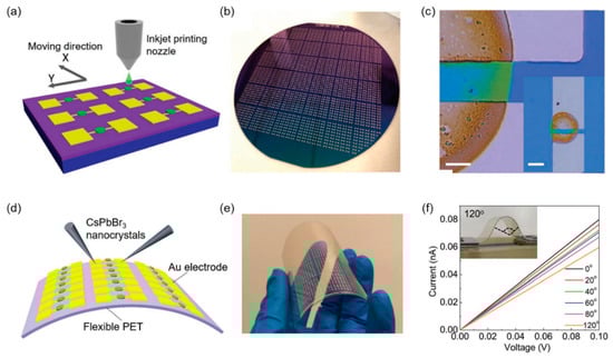 Inkjet printing technology represents a highly established method for thin-film manufacturing with applications in electronics, optics, bioengineering, and other fields []. This technology has the advantages of low manufacturing costs, a simple and flexible process, and no mask plate and lithography, which can be widely used in perovskite solution printing [,]. Figure 3c illustrates the basic components of an inkjet printer including an ink chamber, conducting nozzle, substrate, and translational stage []. When a voltage is applied between the substrate and the nozzle, a curved liquid surface is formed at the nozzle under the action of the induced electric field force []. As the voltage gradually increases, small droplets are formed and ejected onto the substrate (Figure 3d) []. The movement of the nozzle and the mode of the applied voltage can control the pattern printed on the substrate [,,]. In 2019, Jingying Liu et al. homogeneously prepared perovskite films on different nature substrates by the inexpensive inkjet printing method (Figure 3e) []. The cheap and simple inkjet printing method enables the large-scale manufacturing of multi-channel arrays of perovskite-based X-ray detectors.