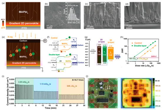 In 2021, Xiuwen Xu et al. developed a double-layer perovskite film with a properly aligned energy level, where 2D (PEA)2MA3Pb4I13 (PEA = 2-phenylethylammonium, MA = methylammonium) is cascaded with vertically crystallized 3D MAPbI3 (Figure 8a–d) []. Combining the fast carrier transport of the 3D layer and mitigated ion migration of the 2D layer, X-ray detectors provide high sensitivity and very stable baselines. Moreover, the 2D layer increases the film resistivity and enlarges the energy barrier for the hole injection without compromising carrier extraction (Figure 8e–g). As a result, the obtained double-layer perovskite detector exhibits a high sensitivity (1.95 × 104 µC Gyair−1 cm−2) and a low detection limit (480 nGyair s−1) (Figure 8h). The double-layer perovskite detector exhibits excellent stability and a highly repeatable X-ray response when the X-ray is periodically on/off (Figure 8i). X-ray images of the printed circuit boards obtained with a double-layer perovskite detector with an active area of 3 mm × 3 mm are shown in Figure 8j.