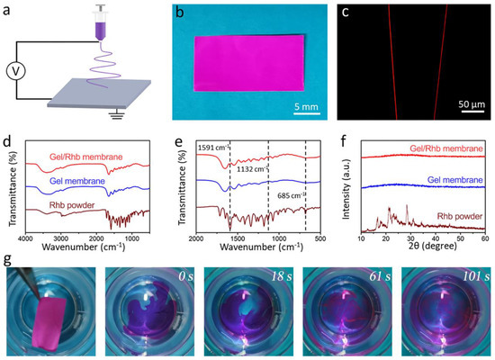 (a) Schematic illustration of the process of fabricating of Gel/Rhb membrane by electrspinning. (b) Optical image exhibiting the red appearance of the Gel/Rhb membrane. (c) Image of the Gel/Rhb nanofibers from fluorescence microscopy. (d) FTIR spectra and (e) partial enlarged FTIR spectra. (f) XRD patterns of Rhb powder, pristine Gel membrane, and Gel/Rhb membrane. (g) Fast dissolution process of the Gel/Rhb membrane.