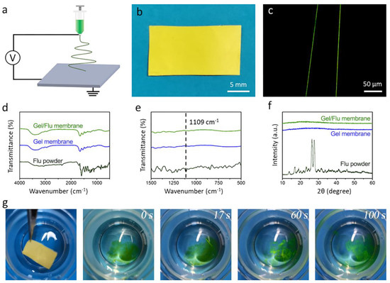 (a) Schematic illustration of the electrospinning equipment. (b) Optical image exhibiting the prepared sample of the Gel/Flu membrane. (c) Image of the Gel/Flu nanofibers from the flurescent microscope. (d) FTIR spectra and (e) Partial enlarged FTIR spectra. (f) XRD images of the Flu powder, pristine Gel membrane, and Gel/Flu membrane. (g) Fast dissolution process of the Gel/Flu membrane.