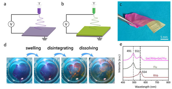 (a,b) Schematic illustration of the sequential electrospinning approach used to fabricate the dual drug-loaded bilayered gelatin nanofibrous membrane. (c) Digital image of the obtained dual drug-loaded nanofibrous membrane. (d) Fast-dissolving process of the dual drug-loaded bilayered gelatin nanofibrous membrane. (e) UV-Vis absorption spectra of Rhb solution, Flu solution, and the solution after dissolving the dual drug-loaded nanofibrous membrane.