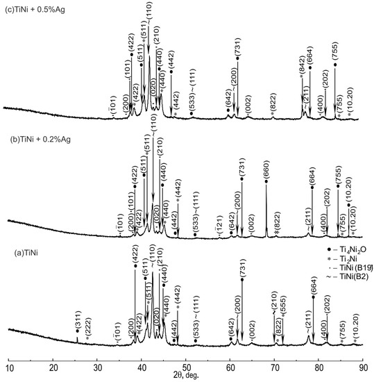 Figure 1 shows X-ray diffraction patterns of TiNi samples containing Ag. The phase composition of the studied alloys consists of Ti4Ni2O, Ti2Ni, TiNi(B19’), and TiNi(B2) phases. Due to the small amount of silver, no Ag-based phases were found.