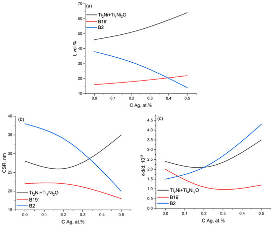 Concentration dependence according to the results of X-ray diffraction analysis of TiNiAg: (a) volume fraction of the phases; (b) CSR values; (c) microdistortions.