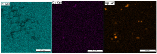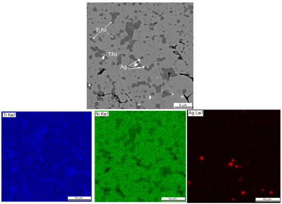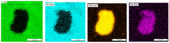 The presence of silver in the form of light inclusions up to 0.1 µm was detected on the SEM–EDS maps of element distribution in porous SHS alloys TiNi + 0.2% Ag, TiNi + 0.5% Ag (Figure 5 and Figure 6, Table 3 and Table 4). The localization of silver particles is predominantly on the particles of the Ti2Ni or Ti4Ni2O phases.