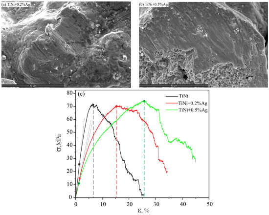 The fracture surface of the alloy sample for TiNi + 0.2% Ag (a); TiNi + 0.5% Ag (b); σ-ε dependence for the alloys of the TiNiAg system (c).