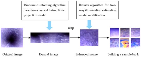 The image obtained using the above acquisition platform contains 3D information. In order to facilitate the subsequent image feature extraction, it is necessary to conduct panoramic expansion of the 3D image. As the pipeline is usually buried underground or in a dark environment, the acquired image is dark and the corrosion area is not obvious in the background, so an image enhancement algorithm is required to preprocess the image. Figure 3 is the process diagram of pretreatment.