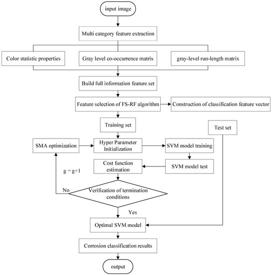 In this paper, a variety of defect features, including color features, gray level co-occurrence matrix, and gray level run length matrix features, are extracted from the pipeline inner wall corrosion image, and then these features are fused and combined with the random forest algorithm (FS-RF) improved by feature simplification algorithm to filter the fused features, and finally, the key and effective feature data set is extracted. Finally, the SVM classification model is used to test the extracted feature dataset, and the SMA (slime mold optimization algorithm) is used to optimize the SVM classifier, which improves the accuracy of recognition classification. The overall experimental process of this paper is shown in Figure 8.