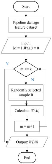 The purpose of the feature simplification algorithm is to reduce the interference of some useless features of the random forest algorithm in the calculation of the Gini index value in the decision tree and to eliminate features that have little influence on the identification of damage to the inner wall of the pipe. By calculating the correlation between each feature parameter and different damage category samples, each feature parameter is assigned a corresponding weight, and the features are ranked and filtered according to the magnitude of the weights. Figure 10 is the algorithm flow chart of FS.