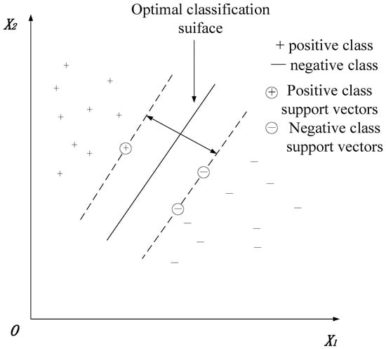 The sample data satisfying Equation (4) is the “support vector,” and the interval (Margin) between the two categories is defined in Equation (5) and is called the maximum interval.