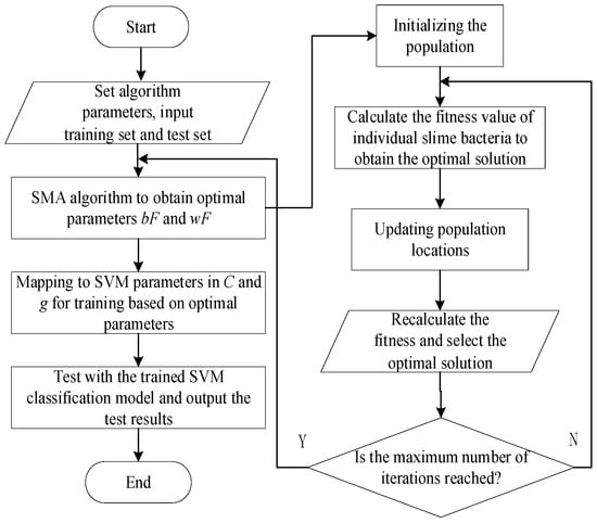 The penalty factor in the support vector machine (SVM) classification model with the kernel function parameters was used for the optimization search using the slime mold algorithm (SMA). The classification recognition rate of 30% (397) of the test samples in the sample feature dataset was used as the value of the fitness function in the SMA algorithm for the optimization search of the SVM parameters. The iterative steps of the SMA-SVM learning algorithm are as follows: Figure 12 is the algorithm flow chart.