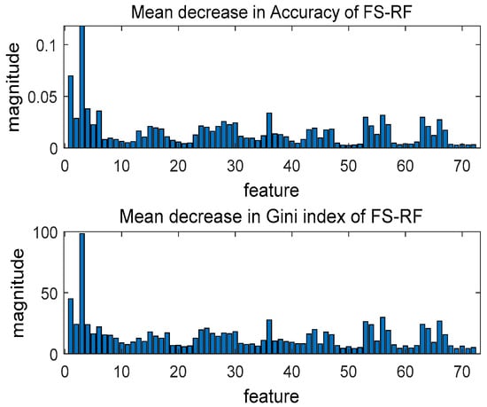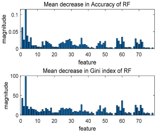 In Figure 13 and Figure 14, “MDA” indicates the degree to which the prediction accuracy of the RF algorithm decreases. The higher the value, the more critical the function is. “MDGini” indicates the degree of influence of each variable on the heterogeneity of observations at each node of the classification tree. The higher the value, the greater the importance of the variable. When calculating feature importance, the improved random forest algorithm has used the simplified algorithm (FS) to eliminate features with zero or very low weights. Only the remaining features are analyzed for feature importance (in this paper, the features eliminated are 41, 43, 44, 55, 66, and 77); the features screened out by the improved random forest algorithm are the same as the features with the lowest importance in the traditional algorithm’s importance ranking. The improved random forest algorithm effectively reduces the random forest error’s upper bound and improves the feature selection’s feasibility.