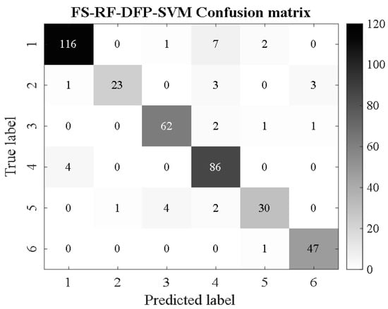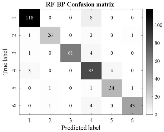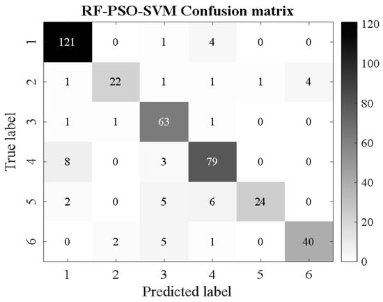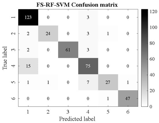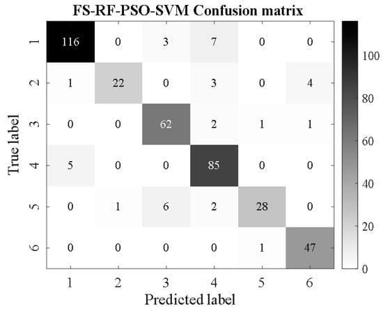 Sample sets after image feature selection are divided into training and test sets and classified in the SMA-SVM classification model. At the same time, in order to better demonstrate the recognition ability of the newly constructed Support Vector Machine Classification Model (SMA-SVM) optimized by the Myxobacteria Optimization Algorithm for corrosion detection in water supply pipelines, its performance is compared with the traditional SVM classifier, the Support Vector Machine Classification Model (DFP-SVM) optimized by differential pollination in [13], and so on. The support vector machine classification model (PSO-SVM) of [31] particle population optimization and the BP network of [32] were compared. These benchmark models were selected because they have been proven by previous studies to be a method for pattern classification. The confusion matrix graph of classification and recognition results is shown in Figure 16, Figure 17, Figure 18, Figure 19, Figure 20, Figure 21, Figure 22, Figure 23, Figure 24 and Figure 25 (where RF represents a random forest algorithm feature and FS-RF represents an improved random forest algorithm).
