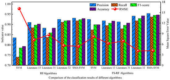 Next, the overall performance of several classification models after feature selection of the traditional random forest algorithm and the improved random forest algorithm was analyzed in terms of algorithm accuracy (Accuracy), precision (Precision), recall (Recall), F1-score and mean square error (RMSE.) [33]. Table 6 shows the results, and to show more graphically the change curves of the classification results of the improved algorithm in this paper with those of the traditional algorithm and other optimization algorithms under these evaluation parameters, Figure 12 compares the results using a bar chart.