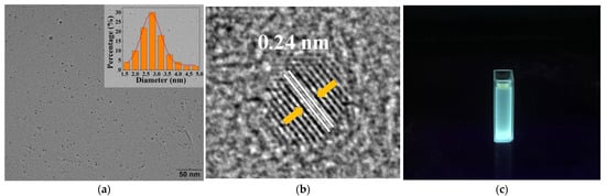 Transmission electron microscopy (TEM) and high-resolution transmission electron microscopy (HRTEM) images were collected using a JEM-2100 transmission electron microscope (JEM-2100, JEOL, Tokyo, Japan). A Shimadzu UV-2550 spectrophotometer was used to record the UV–vis absorption spectra. Fluorescence spectra curves were recorded with a fluorescence spectrofluorometer (F-7000, Hitachi, Tokyo, Japan). Fourier transform infrared spectra (FT-IR) were measured using a Thermo Fisher Nicolet IS10 FT-IR spectrometer (Nicolet IS10, Thermo Fisher, Waltham, MA, USA).