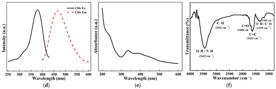 A straightforward one-step microwave-assisted method with anhydrous CA and urea was used to synthesize CDs. The CDs were first characterized by TEM. The TEM photographs confirmed that the resulting CDs had good dispersion in aqueous solution with an average particle size of approximately 2.8 nm (Figure 1a). The HRTEM images showed 0.24 nm lattice stripes, corresponding to the (1120) face of graphite (Figure 1b) [27,28]. Due to their size-limiting effect and photoluminescent properties, bright blue fluorescence was seen in the CD aqueous solution under excitation at 365 nm (Figure 1c). The PL emission spectra in Figure 1d show that when CDs were excited by a laser at wavelengths of 300–400 nm, their dilute solution exhibits a fluorescence emission centered at 467 nm, with an optimal excitation of 376 nm, which indicates that CDs can absorb UV light and convert it into blue light. The CDs’ UV–vis spectra revealed an absorption at around 240 nm that is caused by the π-π* transition and a typical peak at about 380 nm that is attributed to the n-π* leap of C=O/C=N bond (Figure 1e) [29]. FT-IR was used to further investigate the chemical composition and structure of the synthesized CDs. According to Figure 1f, the broad absorption band at 3442 cm−1 is attributed to the stretching vibrations of O-H and N-H bonds [30]. The absorption peak at 2931 cm−1 is attributed to the stretching vibrations of –CH and –CH2, which represent hydrophobic long alkyl chains and aromatic rings [21,31]. The absorption peak at 1688 cm−1 is ascribed to the C=O stretching vibration peak, and the absorption peak at 1400–1200 cm−1 is ascribed to the in-plane bending vibration of O-H and the tensile vibration of C-O, which indicates the presence of –COOH on the CD surface [32]. The FT-IR findings show that the CDs have an amphiphilic structure and the CD surface contains –OH, –COOH, –NH2 and other abundant functional groups.