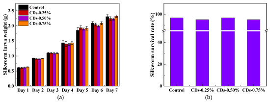 To investigate the safety of CDs for silkworms, the growth status of silkworms was first observed, and for each group, the average weight, growth rate and survival rate of the silkworm larvae were determined. Although these silkworm larvae were divided into four groups and fed different doses of CDs, all silkworm larvae were steadily in the fifth instar, and their weights increased from 0.61 to 2.31 g, with an average growth rate of 0.27 g/d (Figure 2a). Finally, each group’s survival rate reached 95% (Figure 2b). These results preliminarily suggested that the modified diet was safe for silkworms.